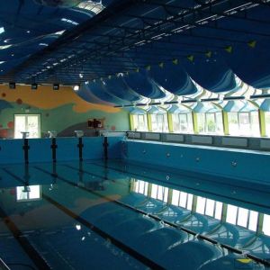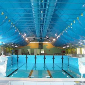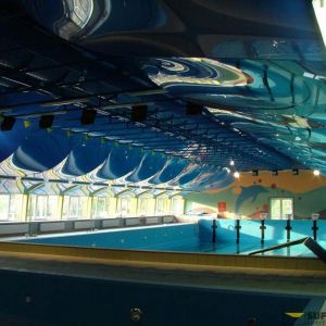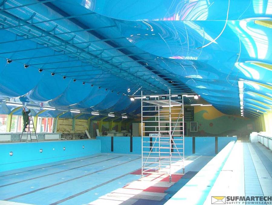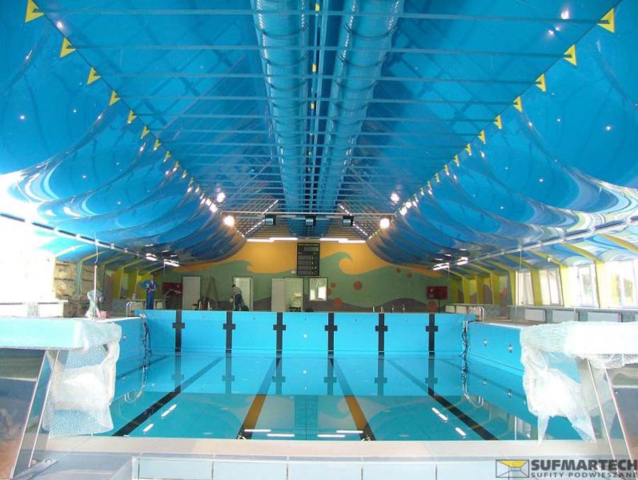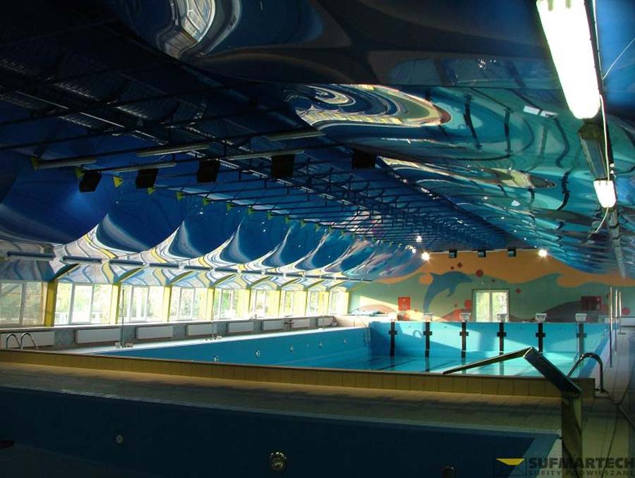 Podczas realizacji w obiekcie basenowym, dla podniesienia estetyki wizualnej, wykorzystano elementy przestrzenne wykonane z sufitu napinanego (profile aluminiowe gięte na specjalne zamówienie), osłaniające znaczną ilość konstrukcji nośnej dachu.