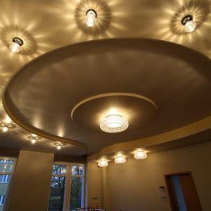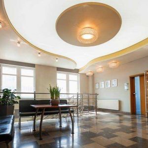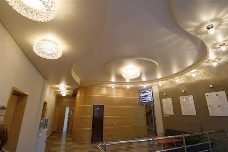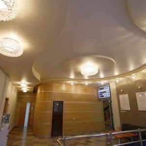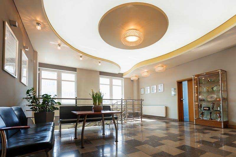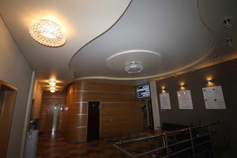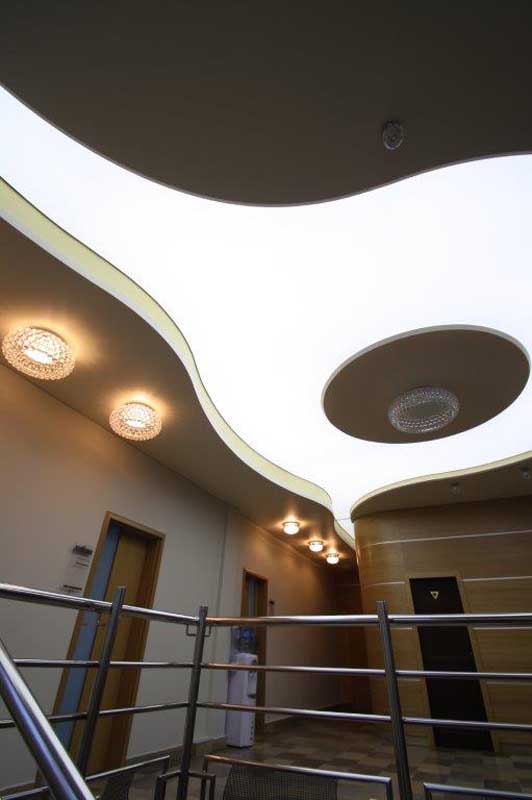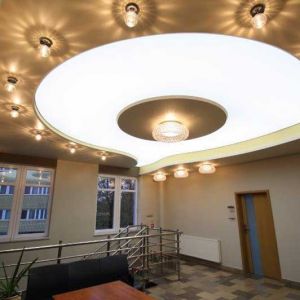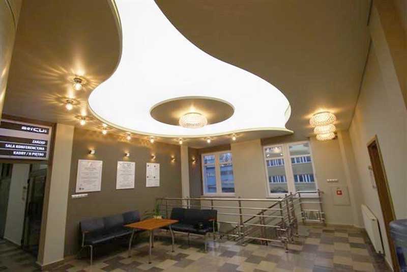 Wykonaliśmy tu sufity napinane w trzech kolorach dostosowanych do kolorystyki ścian oraz oświetlenie.
