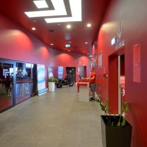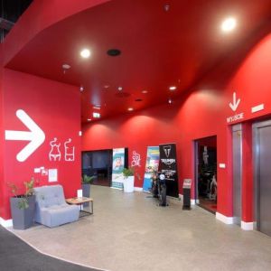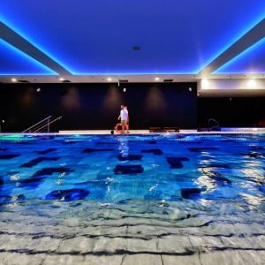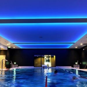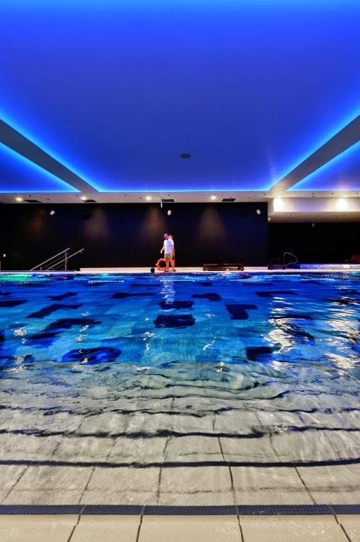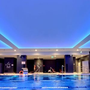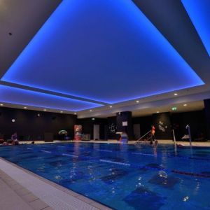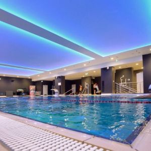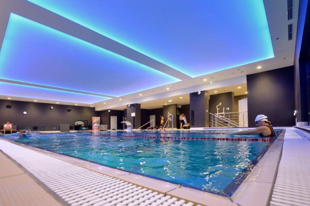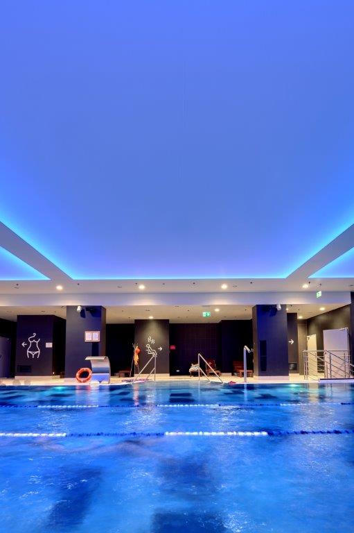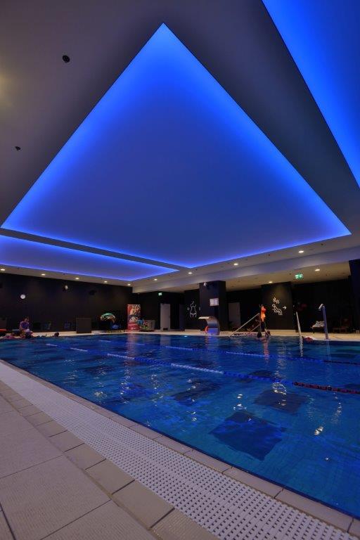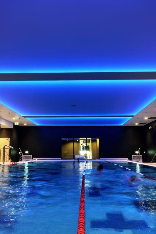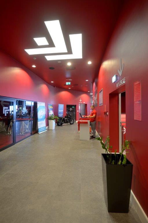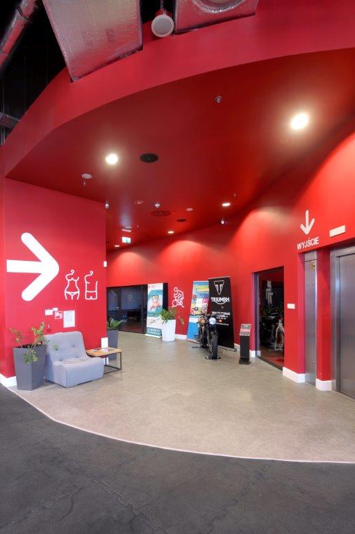 Wykonaliśmy sufity napinane z białej powłoki - nad fit barem; nad strefą wejściową - powłoka sufitu napinanego w kolorze czerwonym z wpisanymi białymi literami stanowiącymi logo firmy Fabryka Formy, wraz z oświetleniem oraz sufity napinane nad niecką basenu.