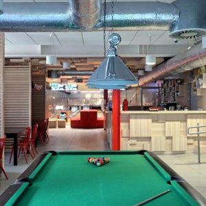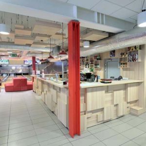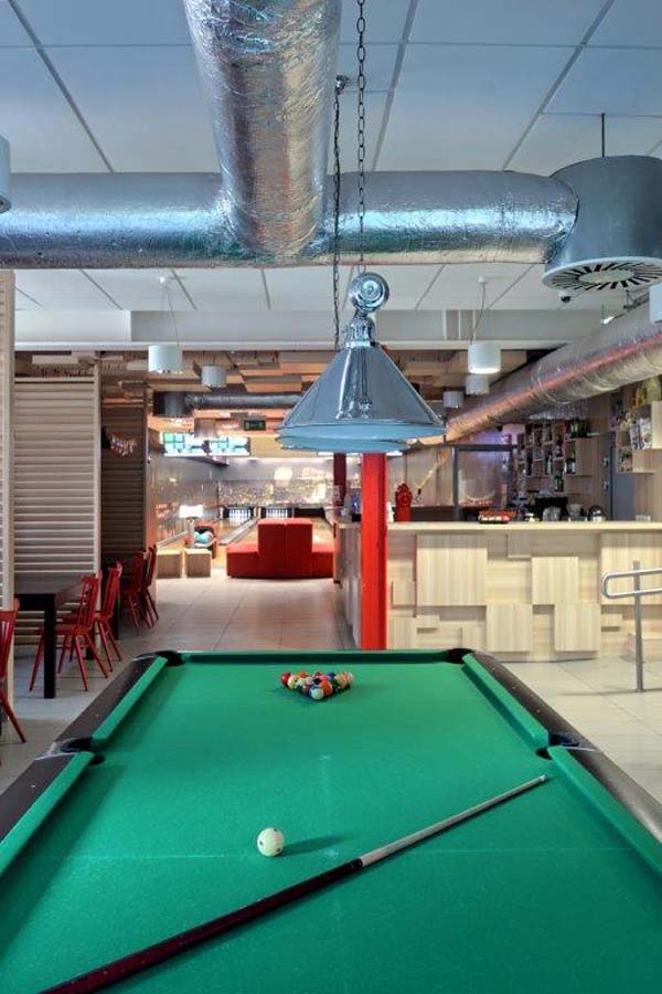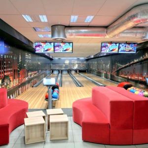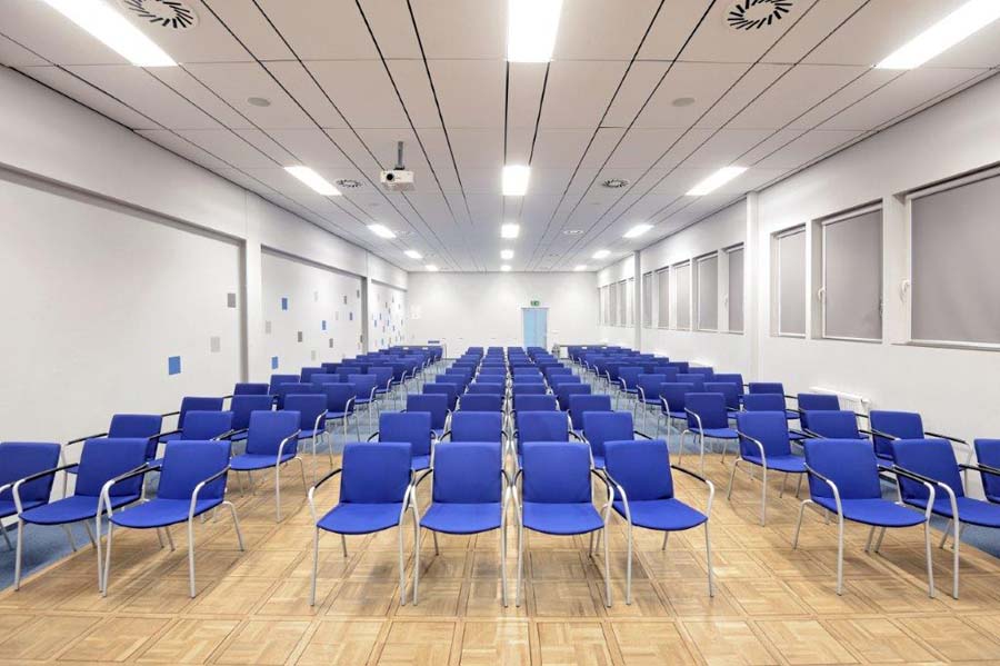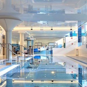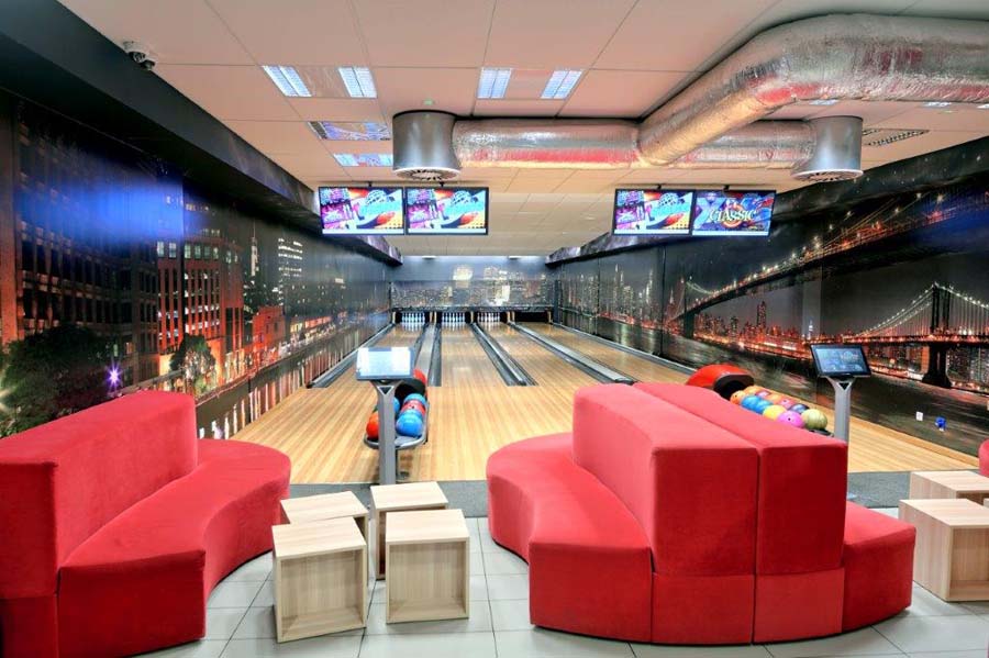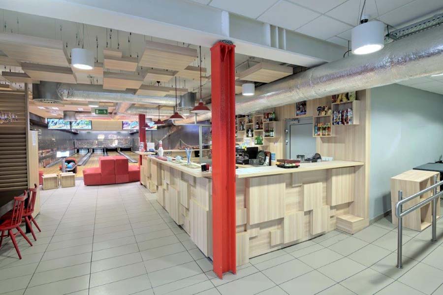Strefa fitness, squash (korytarz, widownia, sala ćwiczeń nr 2 i 3), sala konferencyjna: zastosowano sufitu ecophon typu focus w klasie pochłaniania dźwięku a kręgielnia, strefa rzutu, sala relaksu z barem, strefa odpoczynku: wykonano sufit akustyczny ecophon poprawiający wytłumienie i warunku akustyczne pomieszczeń.