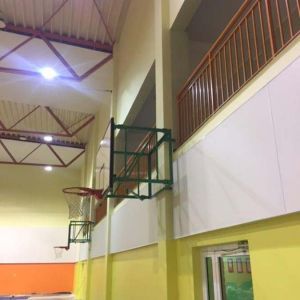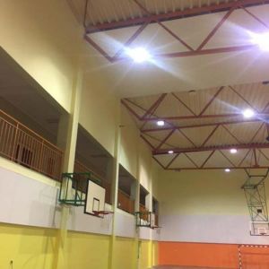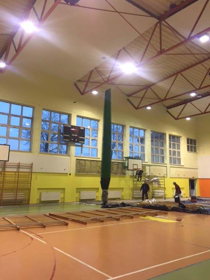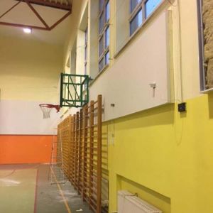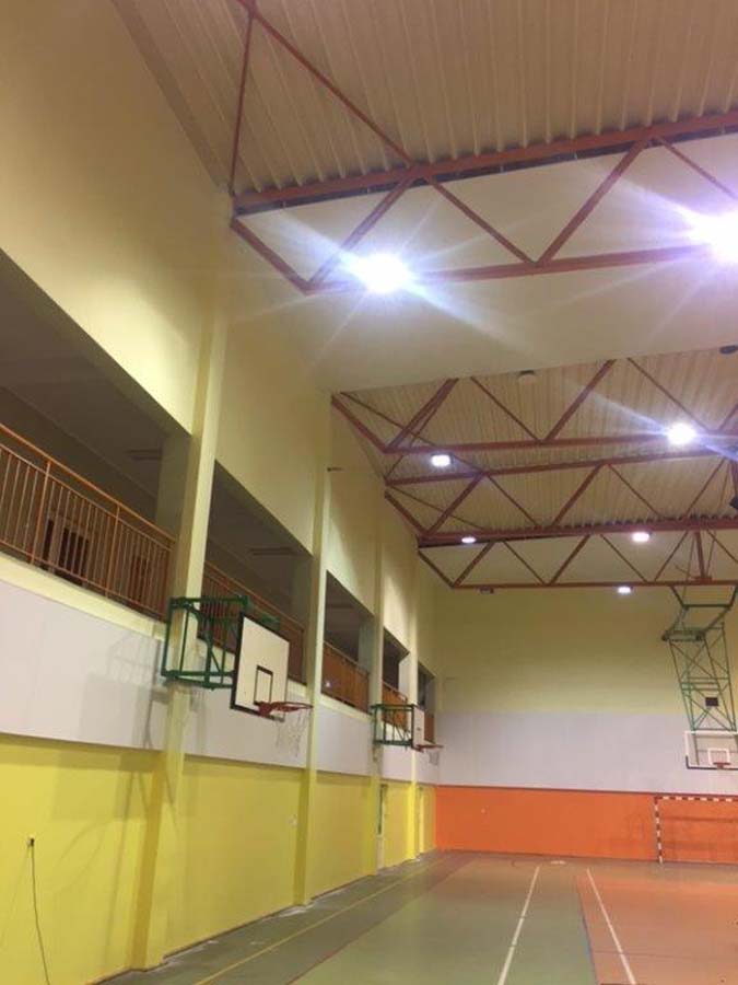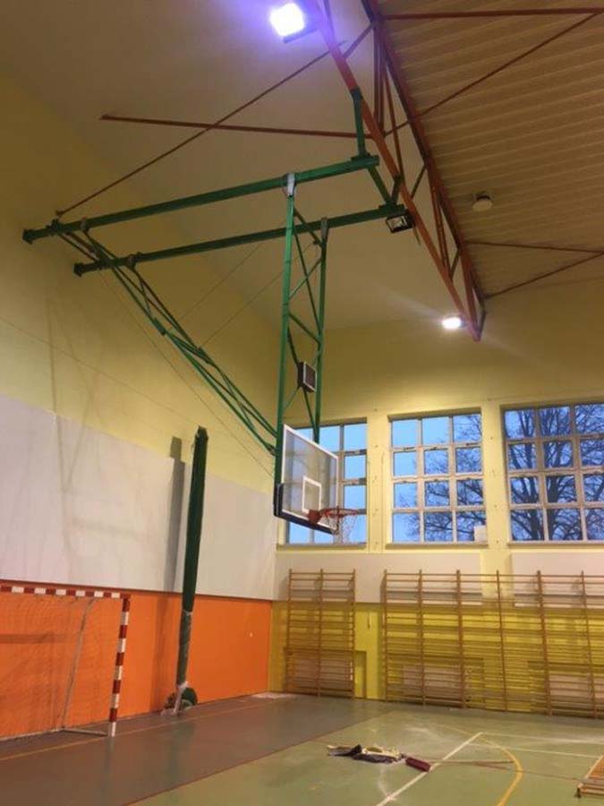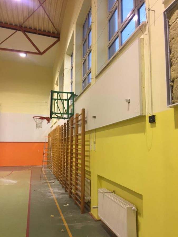 Zakres prac obejmował: wytłumienie hali sportowej poprzez zabudowę sufitami akustycznymi części stropodachu hali i sufitu antresoli oraz montaż akustycznych okładzin ściennych, malowanie ścian obiektu, wymianę oświetlenia na antresoli na energooszczędne oświetlenie LED.