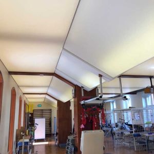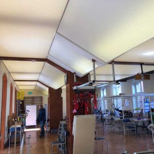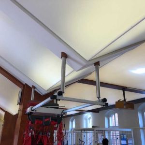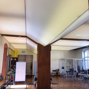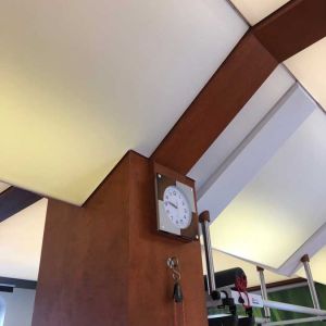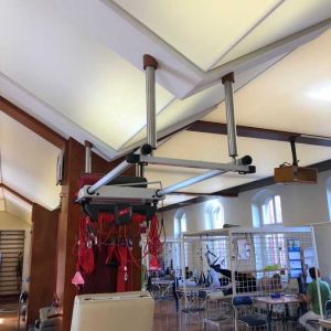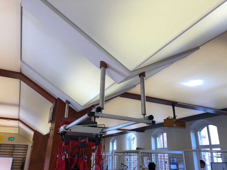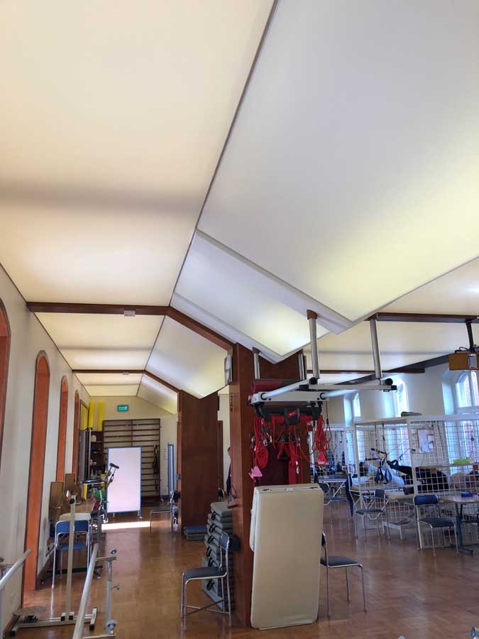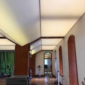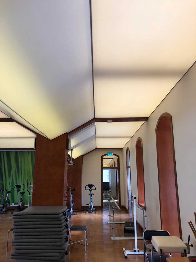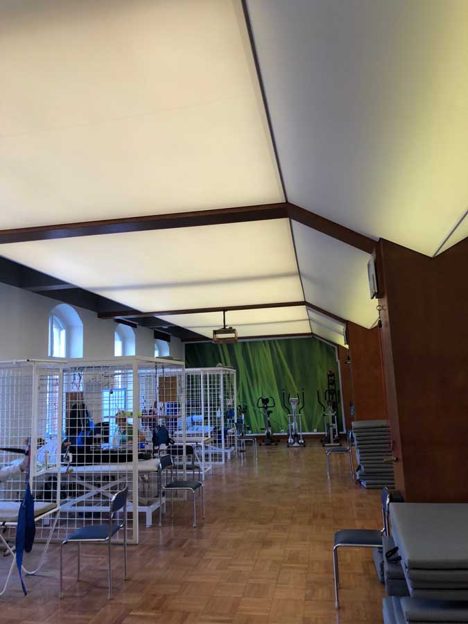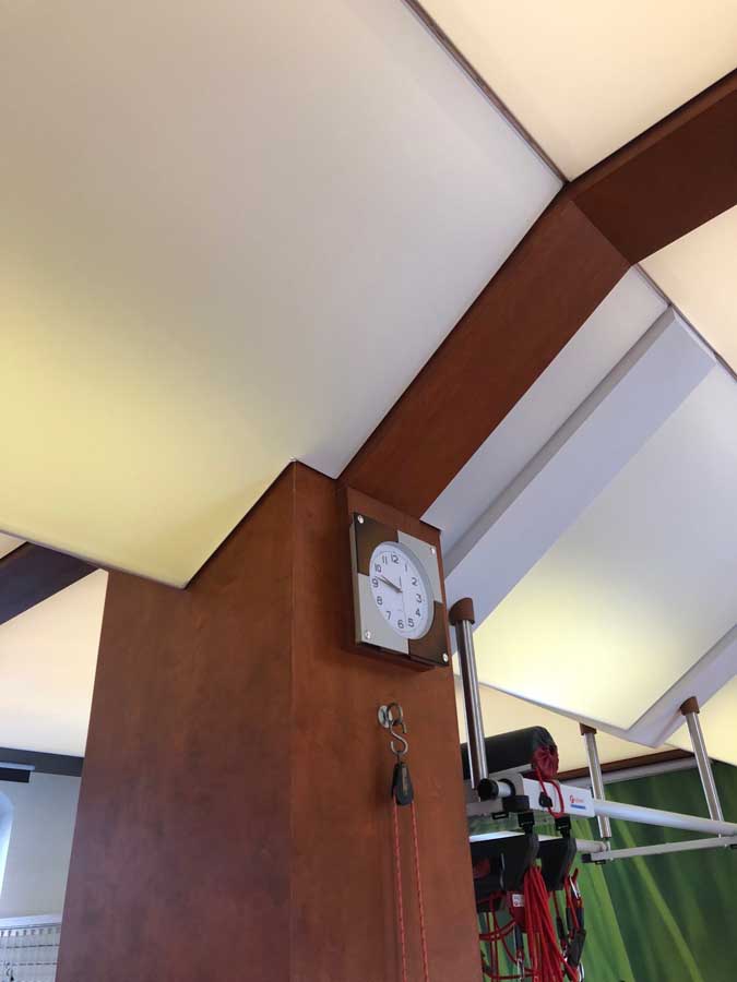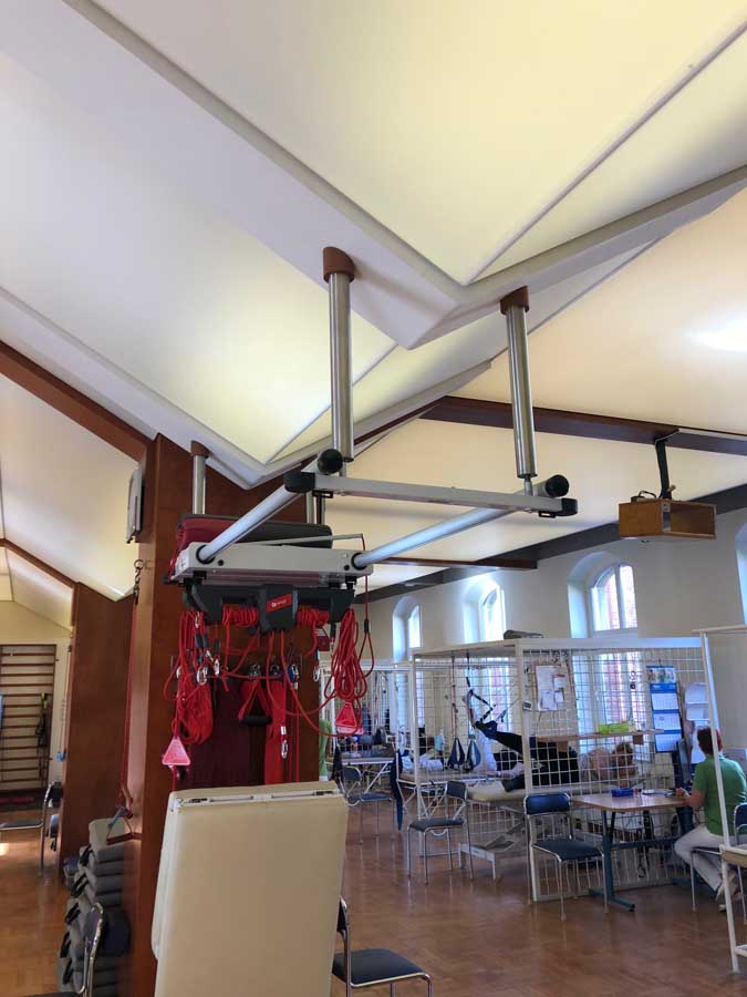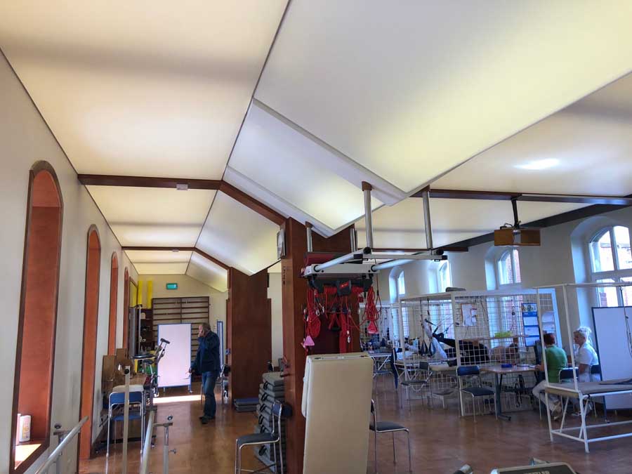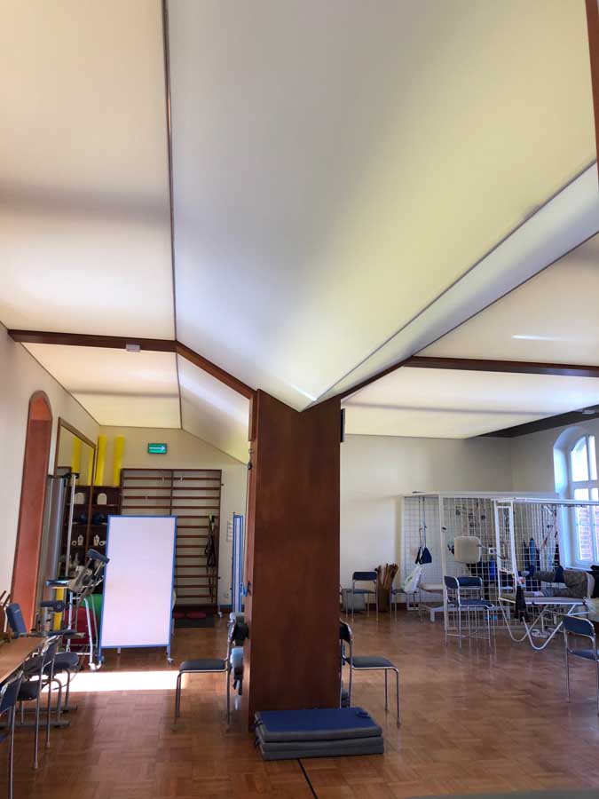 Wykonaliśmy: transparentne sufity napinane wraz z oświetleniem, sufit montowany do ścian i zabudów GK wraz z listwami łamiącymi i separacyjnymi w ramach realizacji zadania: modernizacja wnętrz zespołu rehabilitacji.
