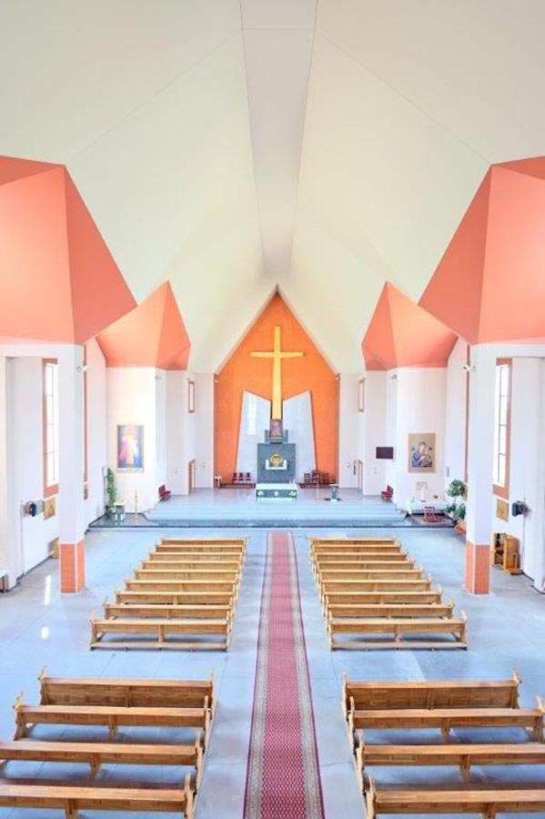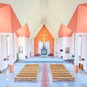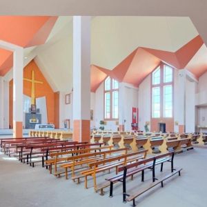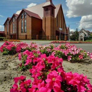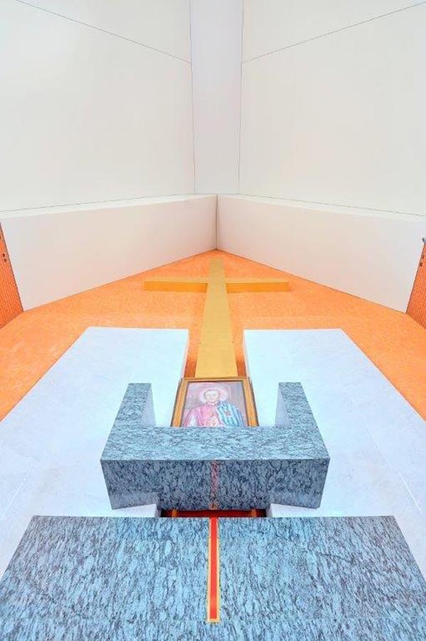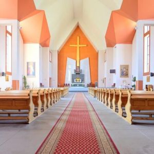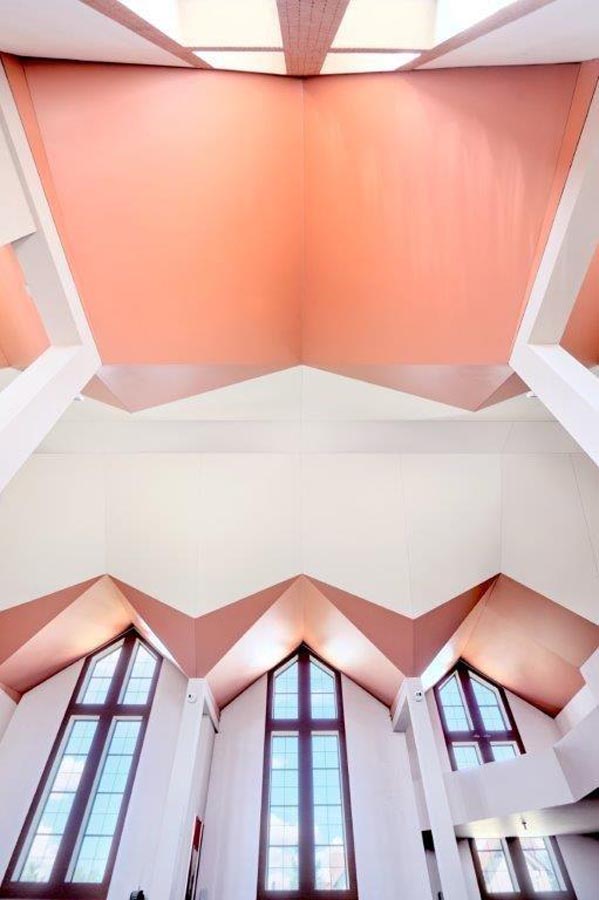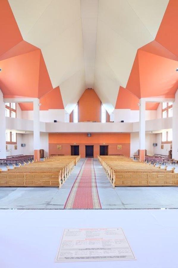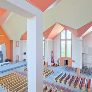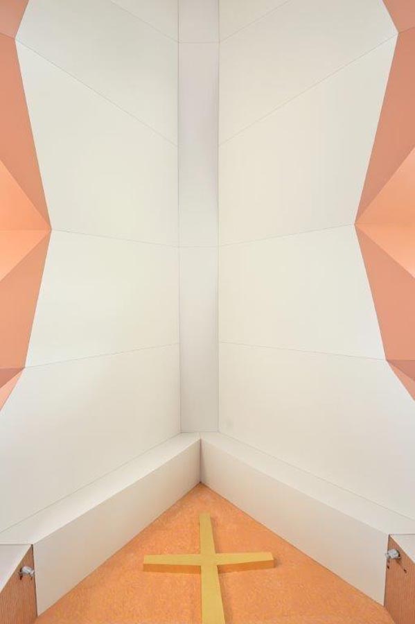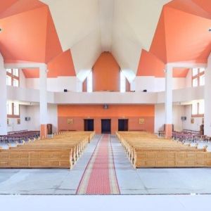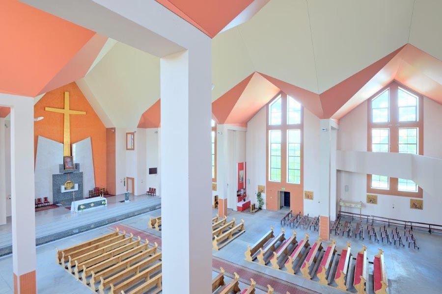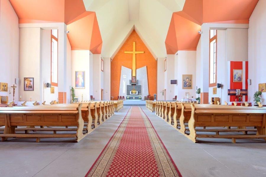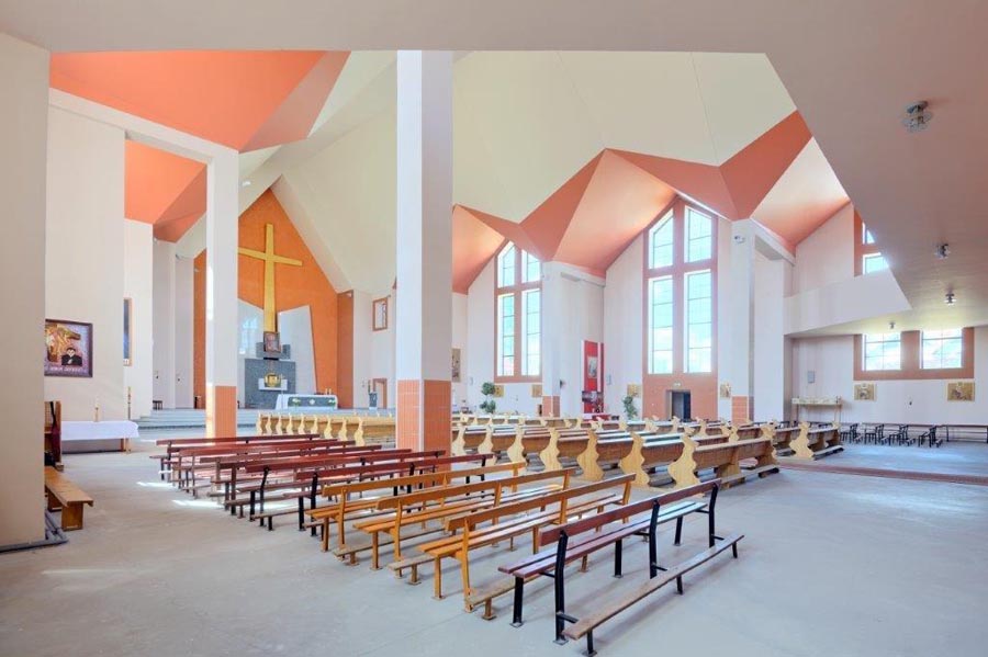 Całość prac została zwieńczona sufitem napinanym w różnej stonowanej kolorystyce. Ze względu na zastosowane materiały zadbaliśmy nie tylko o wyjątkową estetykę i zabezpieczenie Świątyni przed np. pleśnią czy grzybem ale uzyskaliśmy efekty wyjątkowej izolacji akustycznej i zminimalizowania pogłosu.