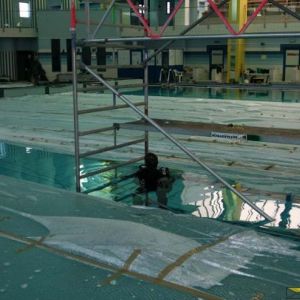 Demontaż sufitu na pływalni Akademii Wychowania Fizycznego w Poznaniu.
