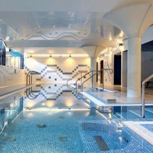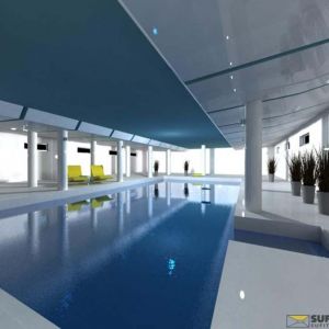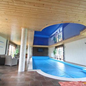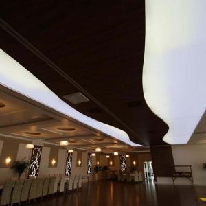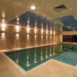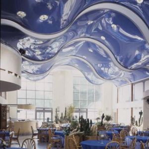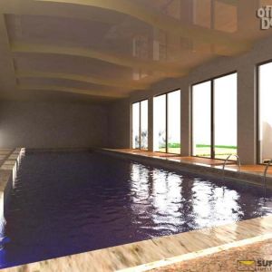 Podczas realizacji w obiekcie basenowym, dla podniesienia estetyki wizualnej, wykorzystano elementy przestrzenne wykonane z sufitu napinanego.