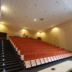 Wykonanie okładzin ściennych Ecophon Texona C w kolorze szarym wraz z podkonstrukcją oraz wykonanie wykuszy projektorowni z giętych płyt gipsowych.