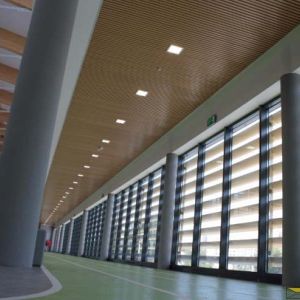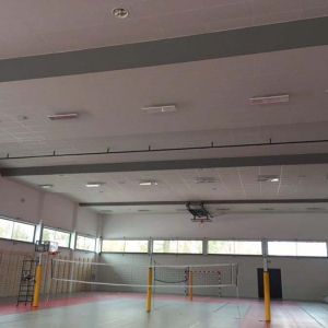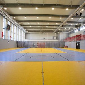 Hala sportowa we Wrześni przy ul. Wojska Polskiego. Dostawa i montaż akustycznych sufitów podwieszanych.