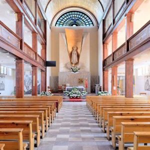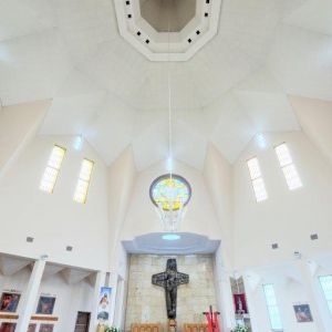 Wykonaliśmy integralną część wystroju wnętrza prezbiterium składającego się z giętych płaszczyzn dekoracyjnych stanowiących tło rzeźby Maryi, jako patrona Kościoła.
