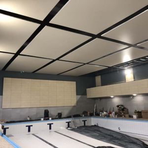 Dostawa i montaż akustycznych sufitów podwieszanych na budowie basenu w Białogardzie.