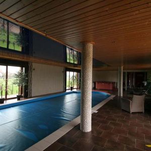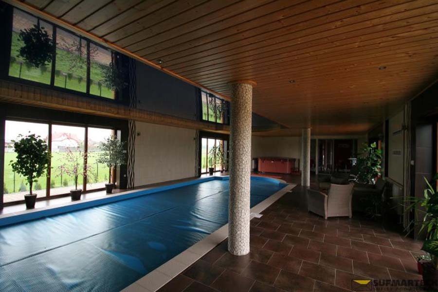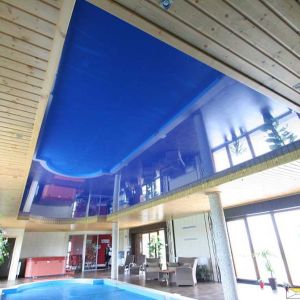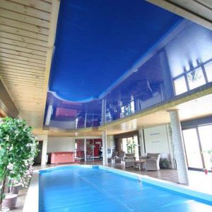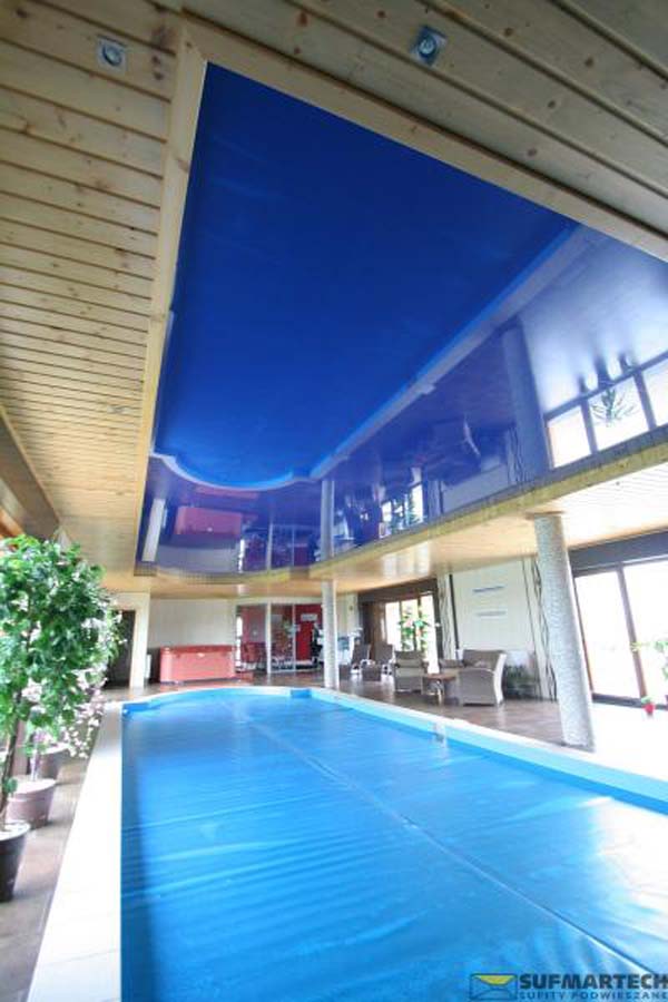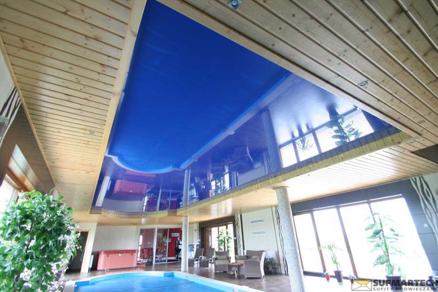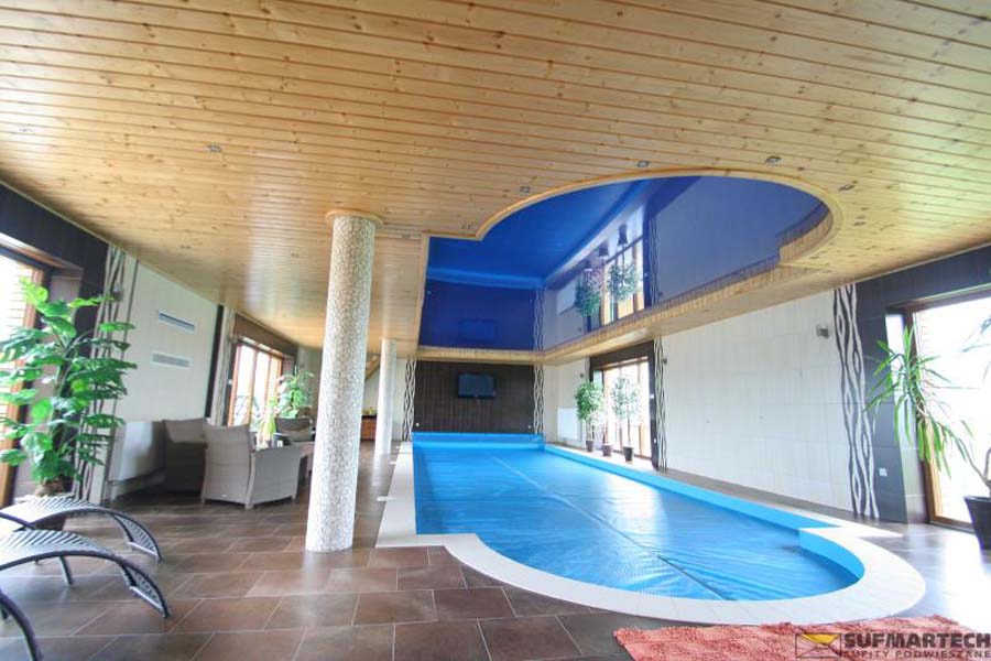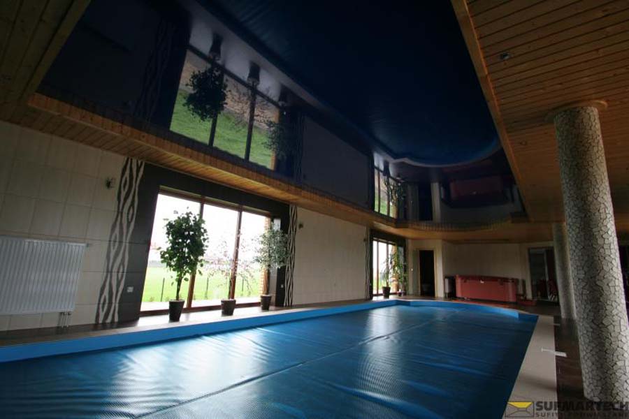 Wykonanie sufitu napinanego nad niecką basenu - w kształcie niecki. Montaż błony napinanej nad jacuzzi oraz w innych pomieszczeniach w rezydencji: kuchnia, gabinet.