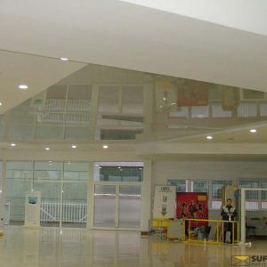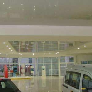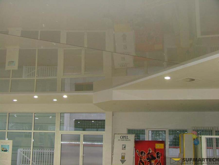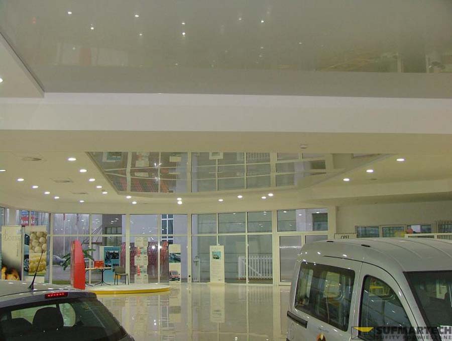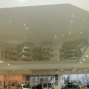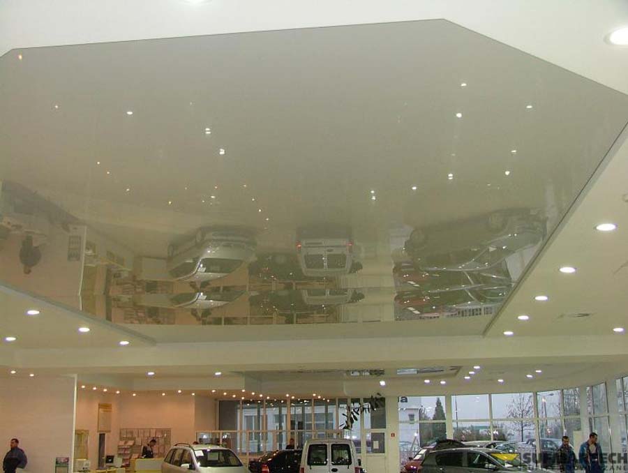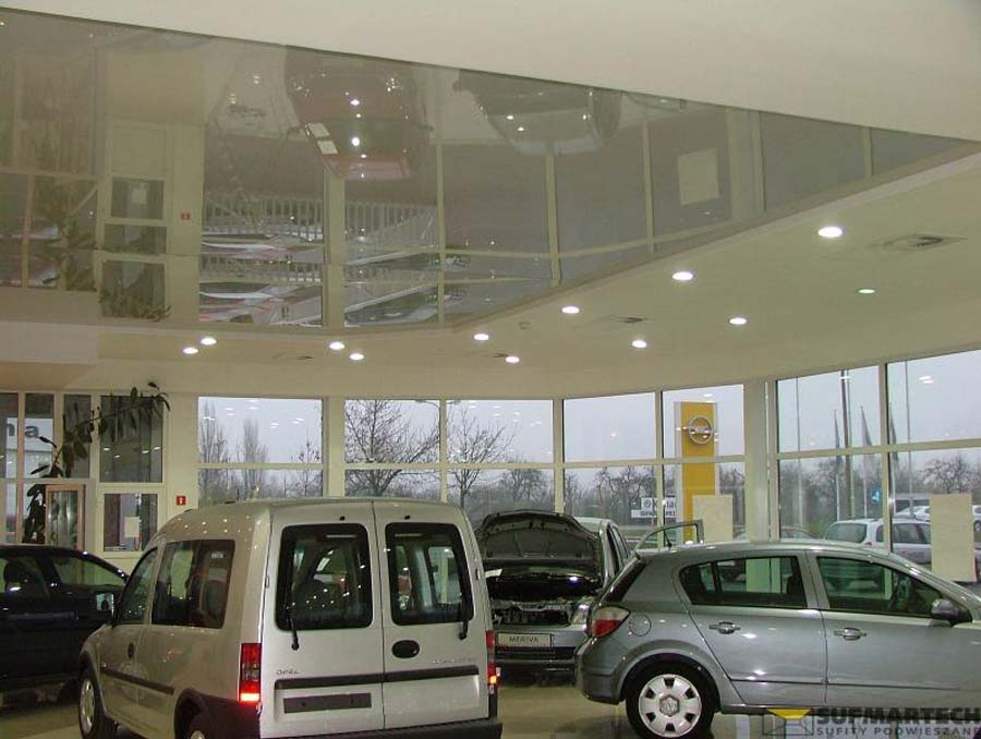 Zastosowano system typu napinanego, duże lustrzane powierzchnie sufitowe podnoszą estetykę salonu, jednocześnie widać samochody w odbiciu salonu.