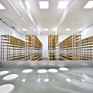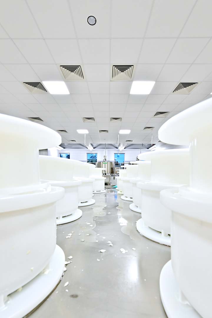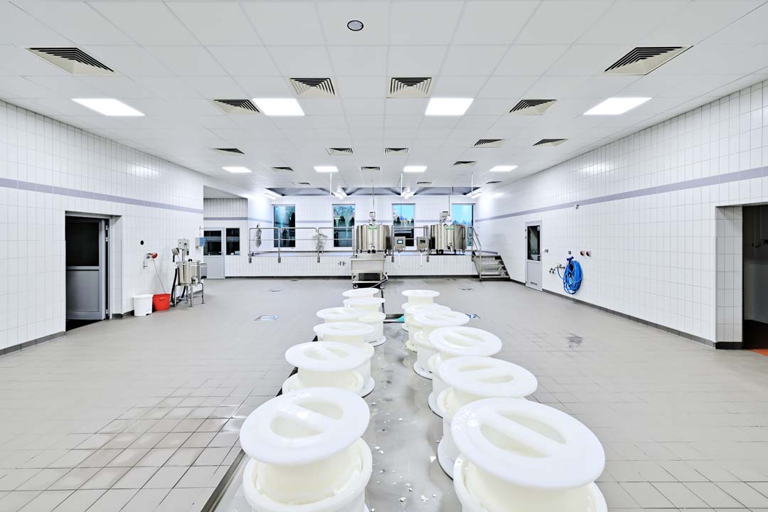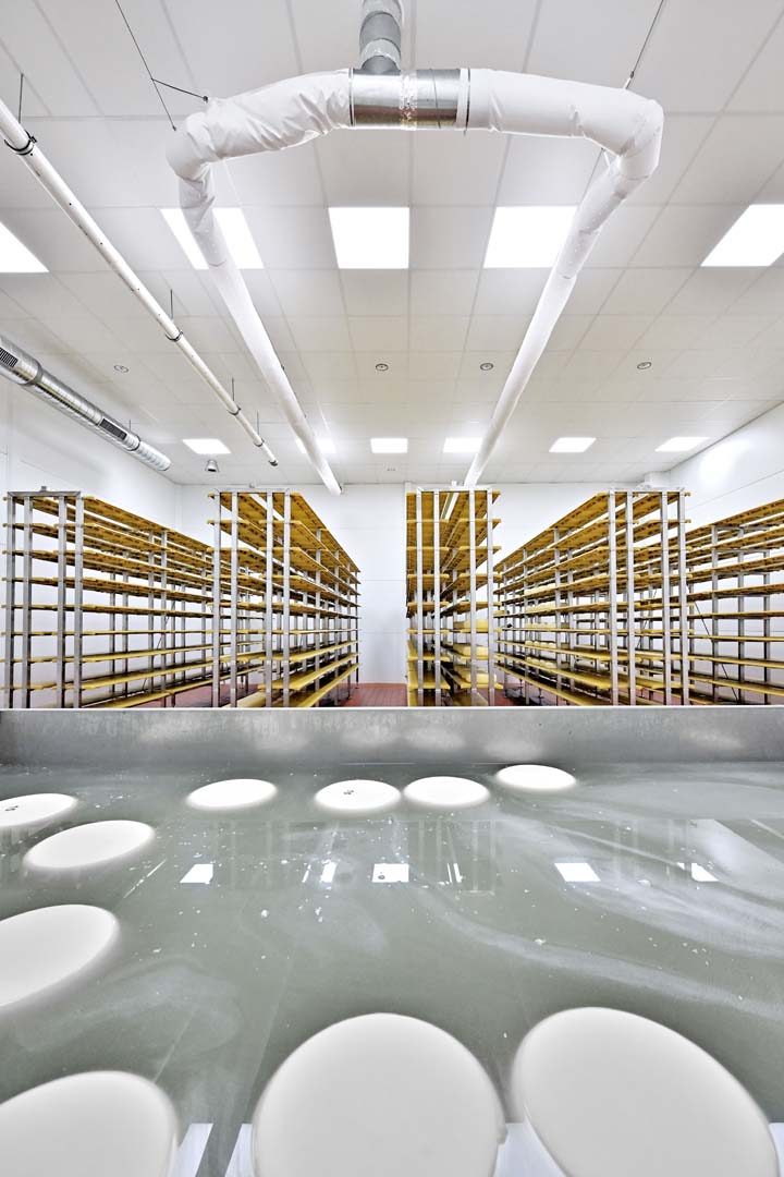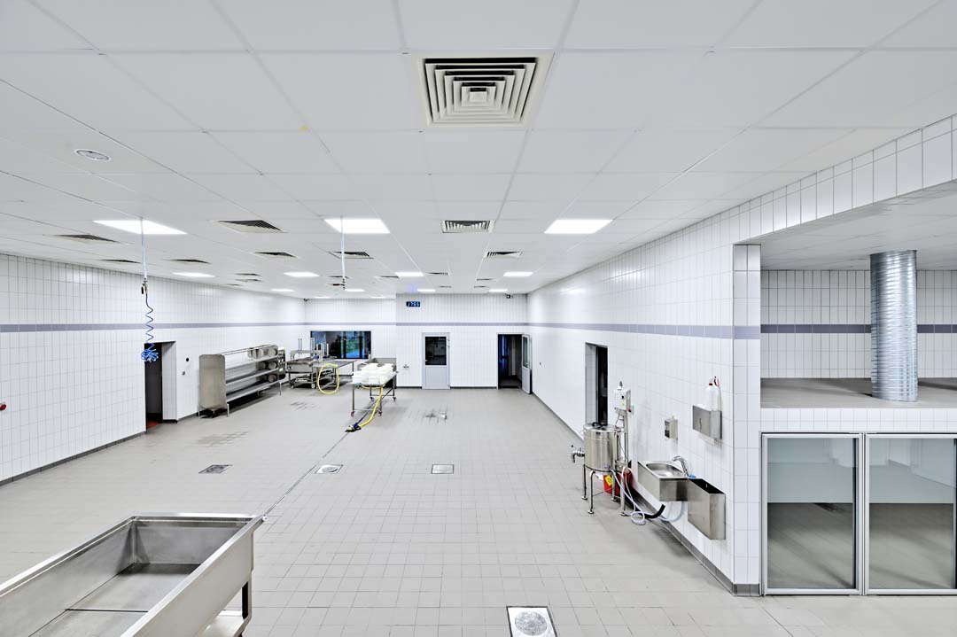 Z kolei w dojrzewalni, w pomieszczeniu z solanką i w sercu produkcji- sufity Rigips Gyprex Asepta, pokryte laminowaną folią PCV i nasączone środkiem bakterio- i grzybobójczym. Sufity te spełniają wysokie wymagania higieniczne.